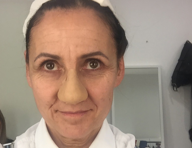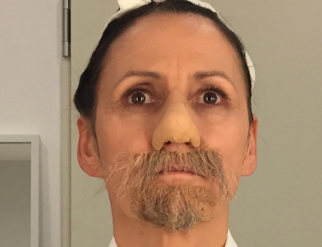 Aus meiner Sicht bietet eine solche Veränderung eine ungeheure Möglichkeit sich in der Rolle auszuleben, sozusagen mit der Maske den Schalter umzulegen und einzutauchen in den anderen Menschen, in diesem Fall den Mann, der da plötzlich im Spiegel auftaucht. An dieser Stelle sei gesagt, dass es für mich als Frau einen besonderen Reiz hat einen Mann zu spielen, die weibliche Zurückhaltung, das Harmoniebedürfnis und das hübsch sein wollen/sollen, hat hier einmal Pause. Beglückend und befreiend zugleich. Und wenn ich nach der Vorstellung die Garderobe verlasse, kann ich mich völlig inkognito unters Volk mischen. Manchmal ganz interessant die Gespräche des Publikums mitzuhören…